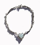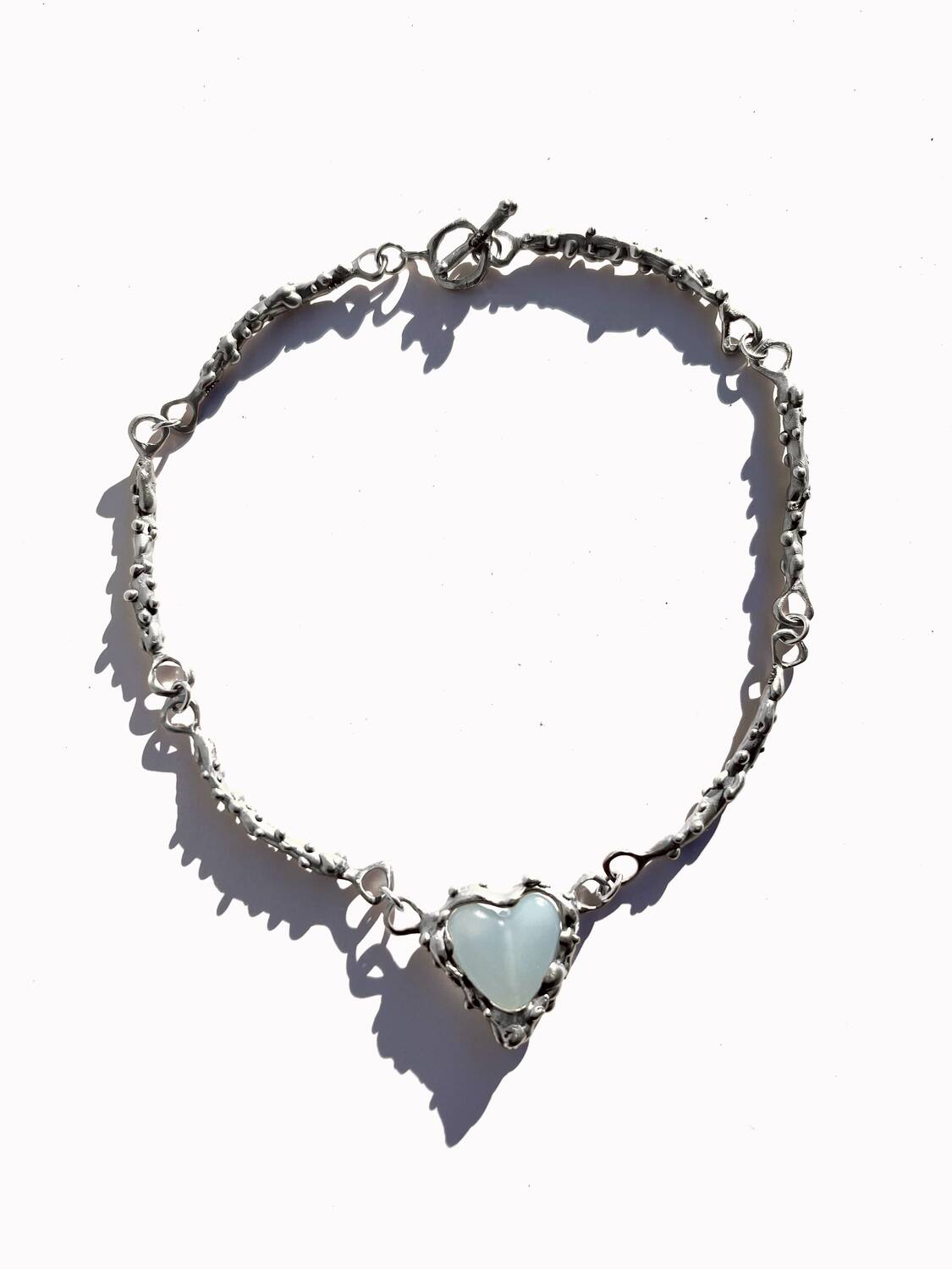 Sterling silver sculptural necklace, with a glass heart in soft powder blue tone.