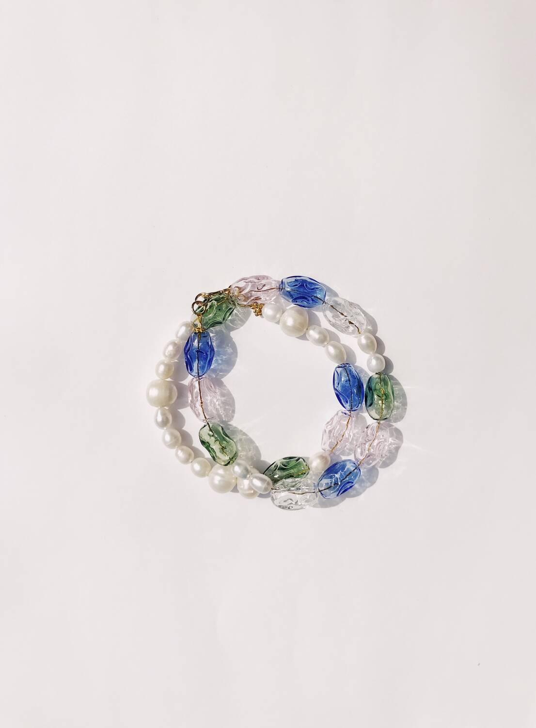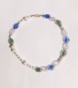 Blown glass beads and fresh water pearls with silver plated in 14k details and fastening.
