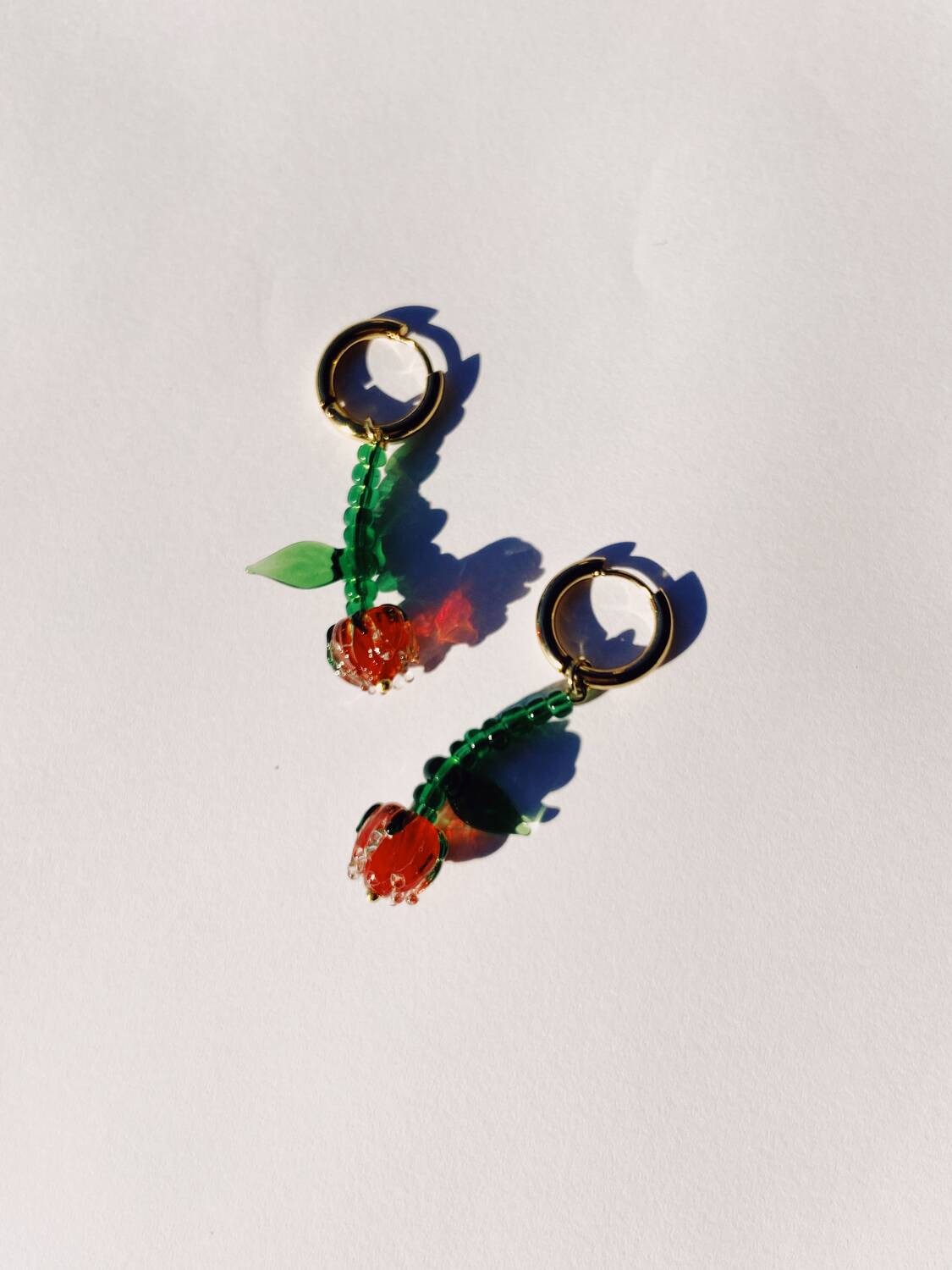 Delicate glass leaf and rose, made in translucid red and cover with another layer of clear glass.